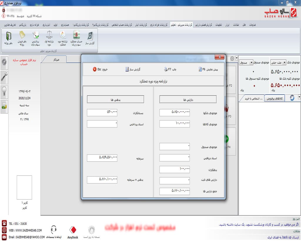 - گزارشات ترازنامه تراز آزمایشی کل دو ستونی، چهار ستونی، شش ستونی، هشت ستونی و ده ستونی همراه با نمایش درختی و براساس محدودیتهای شماره سند و تاریخ و …