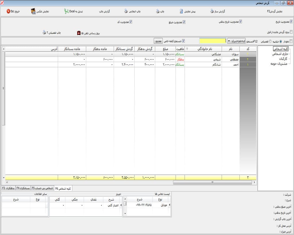 - گردش حساب اشخاص به تفکیک اشخاص بیحساب، بدهکاران و بستانکاران و همچنین گردش هر شخص بهصورت خلاصه و تفصیلی